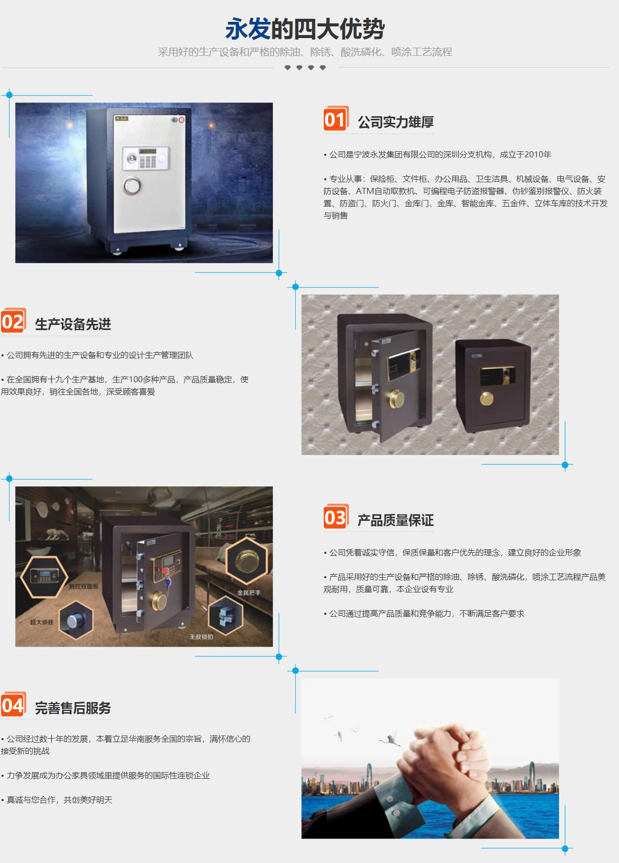 深圳永發(fā)安防產(chǎn)品有限公司 深圳永發(fā)安防產(chǎn)品有限公司,是寧波永發(fā)集團(tuán)有限公司的深圳分支機(jī)構(gòu),成立于2010年,專業(yè)從事:保險(xiǎn)柜、文件柜、辦公用品、衛(wèi)生潔具、機(jī)械設(shè)備、電氣設(shè)備、安防設(shè)備、ATM自動(dòng)取款機(jī)、可編程電子防盜報(bào)警器、偽鈔鑒別報(bào)警儀、防火裝置、防盜門、防火門、金庫(kù)門、金庫(kù)、智能金庫(kù)、五金件、立體車庫(kù)的技術(shù)開(kāi)發(fā)與銷售。